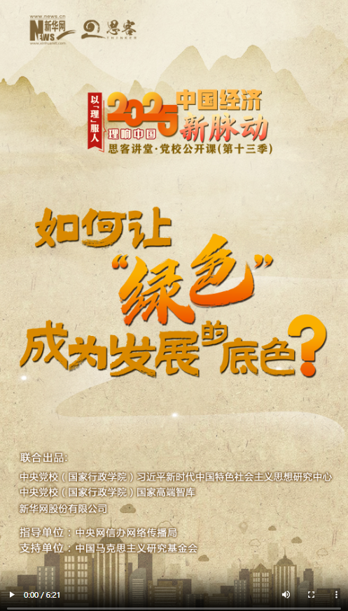 新一季“思客講堂·黨校公開課”《理響中國(guó)·以理服人|2025中國(guó)經(jīng)濟(jì)新脈動(dòng)》,帶你讀懂2025年經(jīng)濟(jì)工作重點(diǎn)。藍(lán)天、碧水、凈土;節(jié)能、減排、降碳;生態(tài)優(yōu)先、綠色消費(fèi)、零碳工廠……一個(gè)個(gè)生動(dòng)的綠色畫筆,勾勒出高質(zhì)量發(fā)展的底色。綠色打底,發(fā)展更優(yōu)。怎么讓“綠色”成為發(fā)展的底色?如何激活全面綠色轉(zhuǎn)型的潛力?中央黨校(國(guó)家行政學(xué)院)社會(huì)和生態(tài)文明教研部副教授韓融給出了答案。