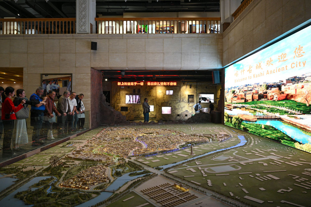 4月25日,來(lái)自埃及、伊朗、土耳其等國(guó)的外賓在喀什市老城區(qū)保護(hù)綜合治理紀(jì)念館參觀。新華社記者 辛悅衛(wèi) 攝