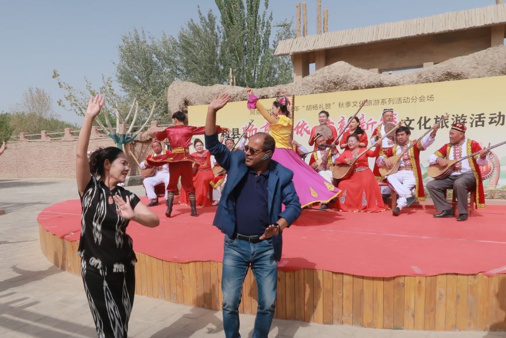 4月26日,外賓在參觀阿克蘇地區(qū)新和縣依其艾日克鎮(zhèn)加依村時(shí),同表演人員跳舞互動(dòng)。新華社記者 時(shí)藝菲 攝