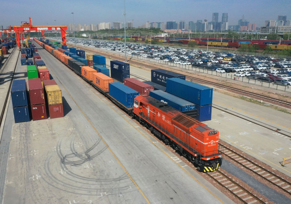 2025年4月15日,X8003次中歐班列(鄭州)??吭趪F集團鄭州局圃田車站(無人機照片)。新華社記者 李嘉南 攝