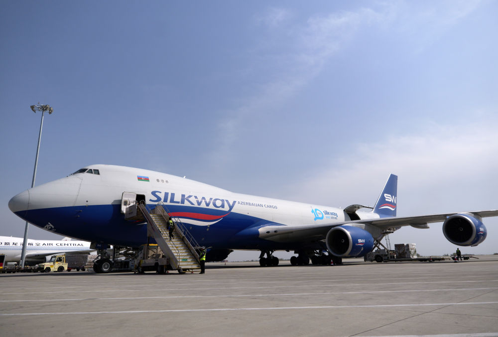 2025年4月2日,一架阿塞拜疆絲綢之路西部航空公司的貨機??吭卩嵵菪锣崌H機場停機坪上。新華社記者 李嘉南 攝