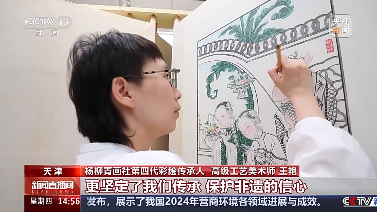 楊柳青木版年畫是首批國家級非遺之一,傳承至今已有400多年。“勾描、木刻、水印、彩繪、裝裱”五道傳統(tǒng)制作技藝,在楊柳青畫社被完整保留和繼承了下來。80后王艷是畫社首批招考的專業(yè)院校傳承人,從事楊柳青年畫彩繪工作已經(jīng)19年了。