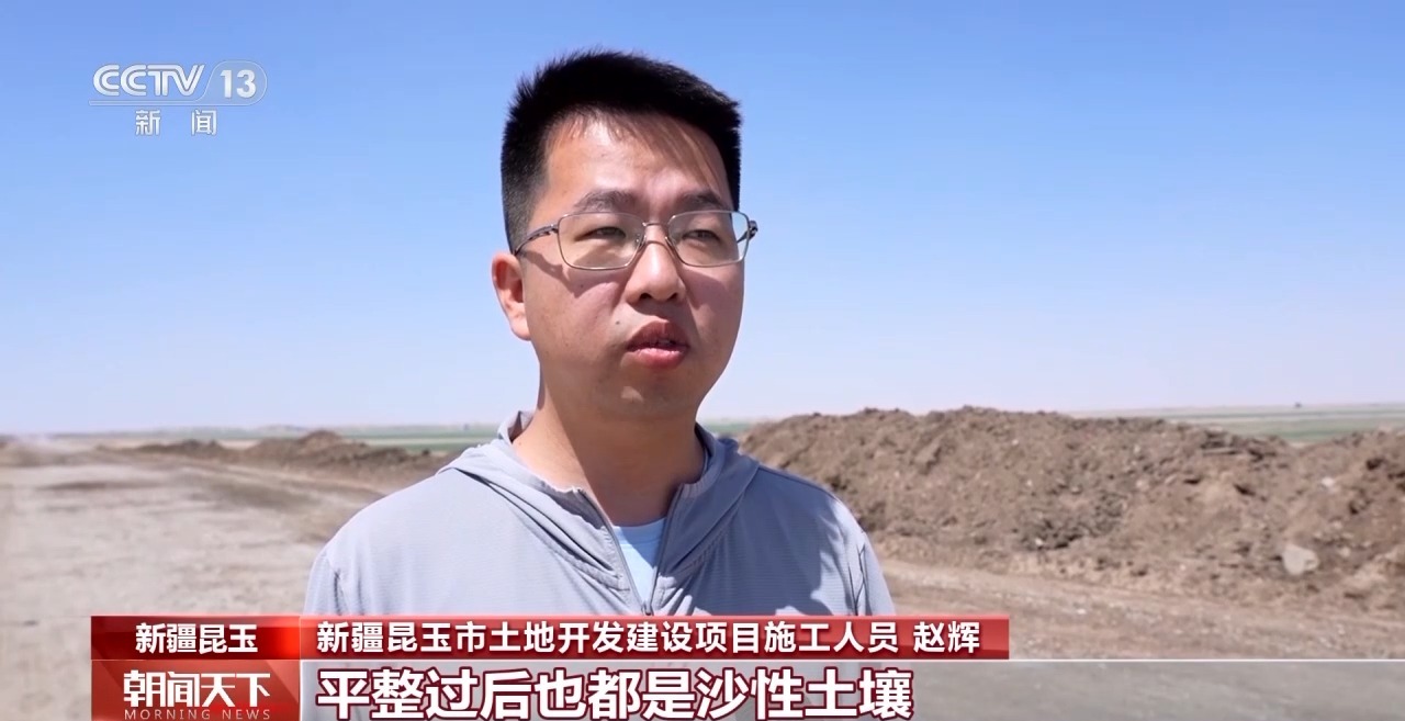 新疆昆玉市土地開發(fā)建設(shè)項(xiàng)目施工員 趙輝:這邊原本都是沙漠原始地貌,平整過后也都是沙性土壤,沙土的營養(yǎng)貧瘠,肥力差,抓一把土,能從指縫里漏掉90%。通過羊糞和水溶肥的有效結(jié)合,施進(jìn)去之后,我們能把沙土的結(jié)構(gòu)團(tuán)?;唵蝸碚f就是把一團(tuán)散沙變成緊密有孔隙的小團(tuán)體,這樣施進(jìn)去的水和營養(yǎng)都能留存住。