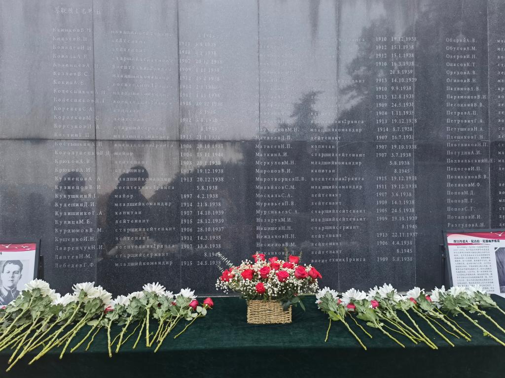在南京抗日航空烈士紀念館鐫刻有蘇聯(lián)籍抗日航空英烈名錄的紀念碑前,擺放著人們獻上的鮮花(資料照片)。新華社記者 邱冰清 攝