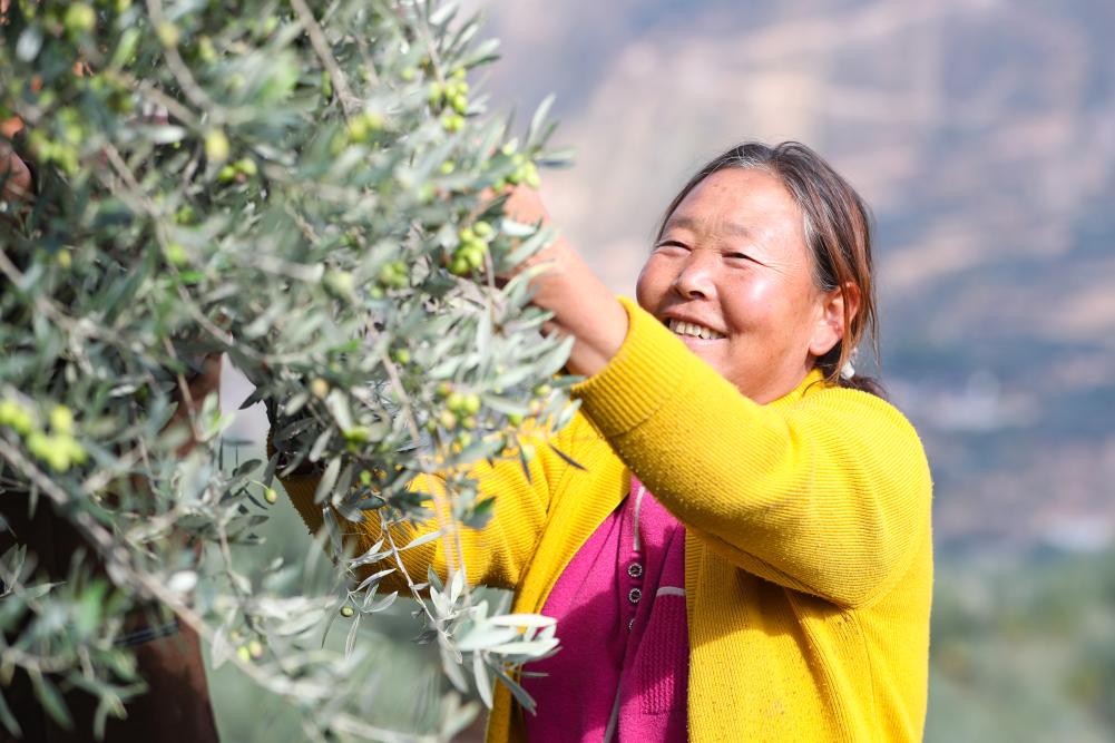 在甘肅省隴南市武都區(qū)一處油橄欖種植基地,農(nóng)戶采摘油橄欖鮮果。新華社記者 郎兵兵 攝
