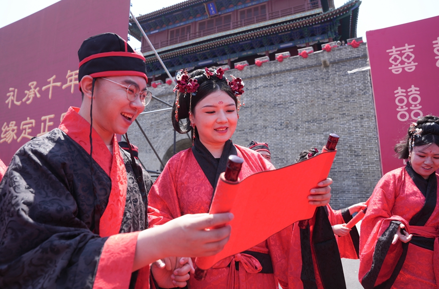 2025年5月17日,在河北省石家莊市正定古城舉行的集體婚禮上,一對(duì)新人在閱讀婚書。新華社發(fā)(梁子棟攝)