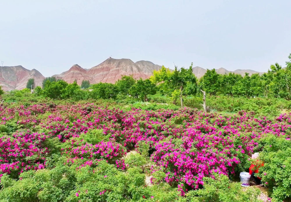 每年春末夏初,大片大片的玫瑰花,一團(tuán)團(tuán)一簇簇,盛開得像一幅油畫,鋪陳在苦水鎮(zhèn)干枯的溝梁間。整個(gè)小鎮(zhèn)沐浴著花香,寫意又嫵媚,盡情展示大西北一年之中最動(dòng)人最美麗的時(shí)刻。