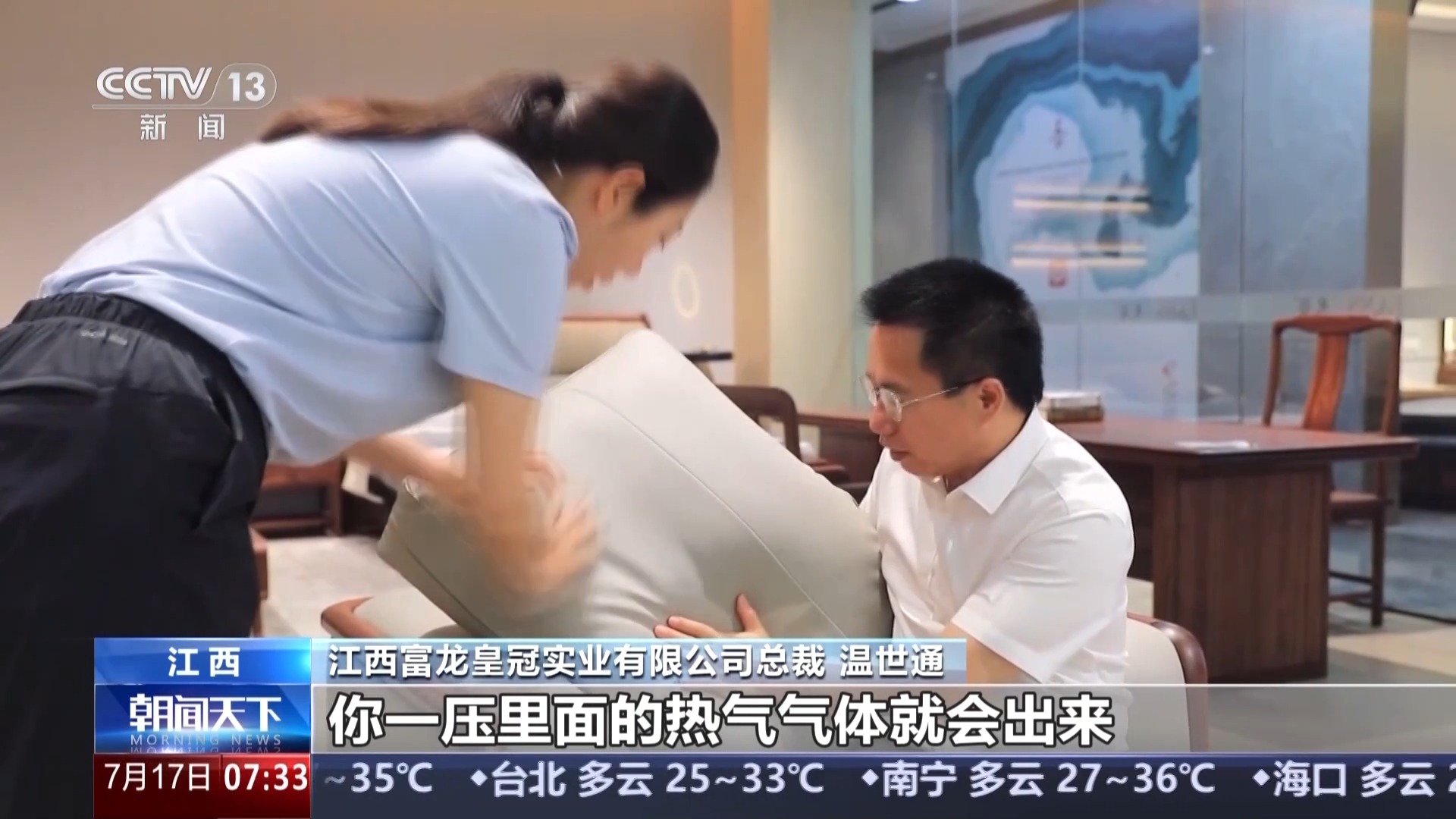 江西富龍皇冠實業(yè)有限公司總裁 溫世通:沙發(fā)靠墊后面我們?nèi)看蛄送笟饪?,一壓里面的熱氣氣體就會出來,保證背部不會有很熱很燙的感覺,在銷售方面保持增長。