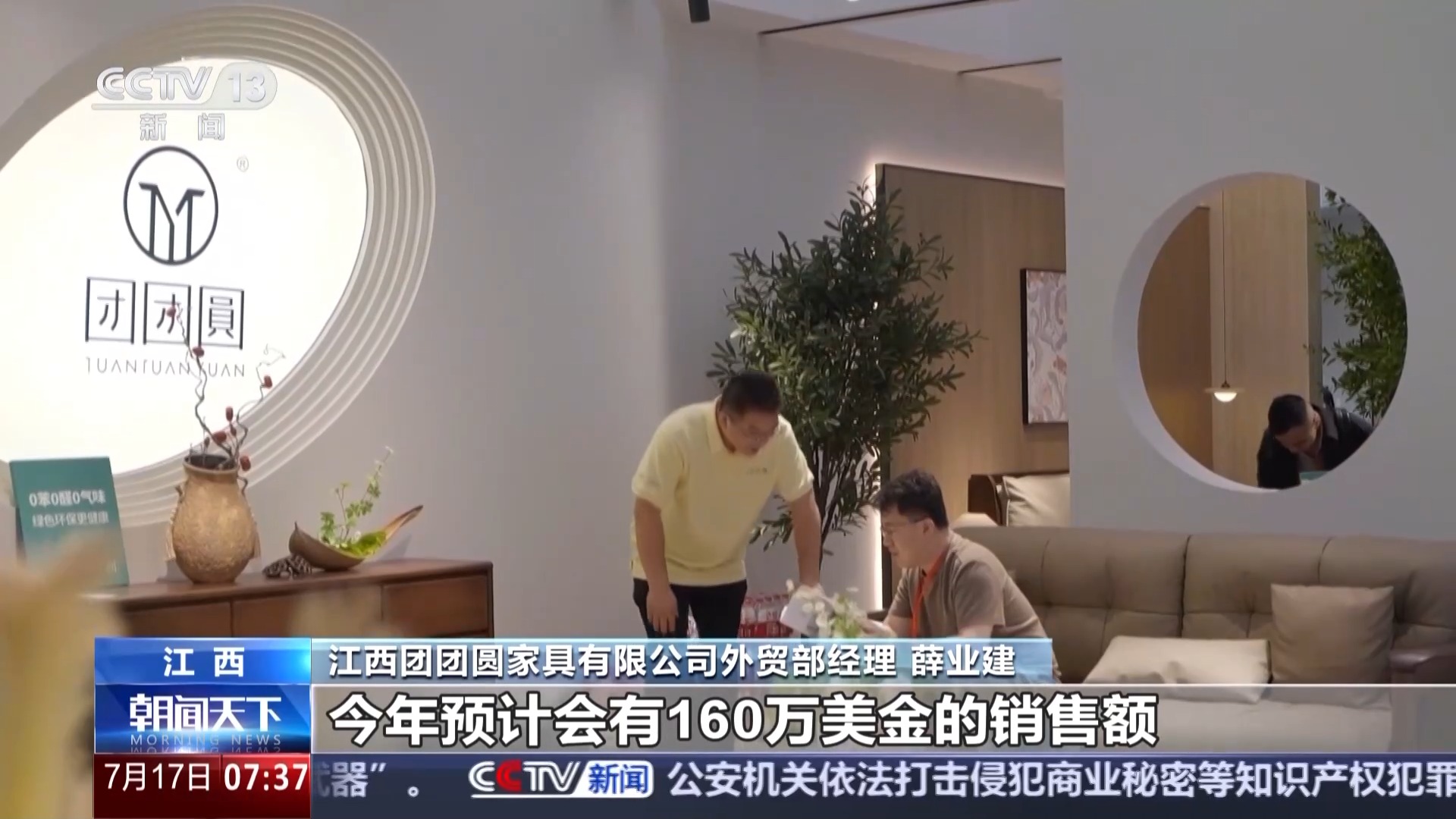 江西團(tuán)團(tuán)圓家具有限公司外貿(mào)部經(jīng)理 薛業(yè)建:家具在7月到11月是一個銷售旺季,今年預(yù)計會有160萬美元的銷售額。