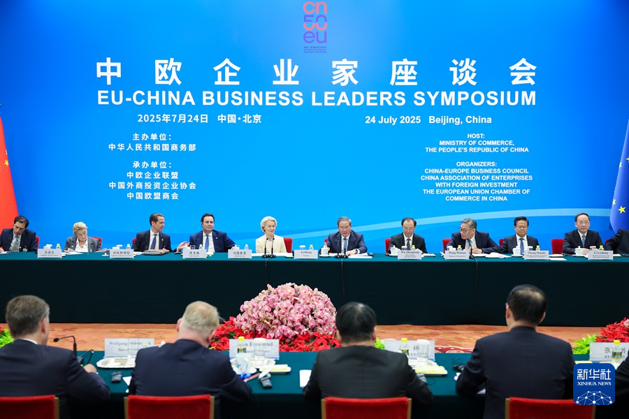 國(guó)務(wù)院總理李強(qiáng)7月24日下午在北京人民大會(huì)堂同歐盟委員會(huì)主席馮德萊恩共同出席中歐企業(yè)家座談會(huì)。近60位中歐商會(huì)和企業(yè)負(fù)責(zé)人出席。