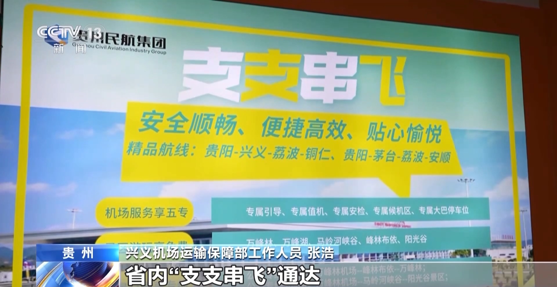 興義機(jī)場運(yùn)輸保障部工作人員 張浩:目前21條航線覆蓋21座城市,省內(nèi)“支支串飛”通達(dá)銅仁、荔波、遵義茅臺等航點(diǎn),興義到貴陽的“貴陽快線”保持每天3班執(zhí)飛。