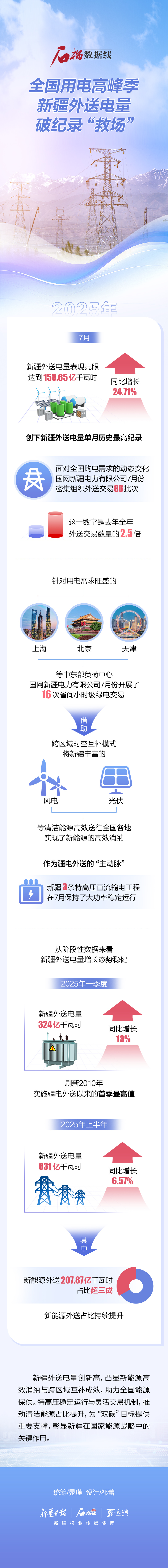 7月新疆外送電量表現(xiàn)亮眼,達(dá)到158.65億千瓦時,同比增長24.71%,創(chuàng)下新疆外送電量單月歷史最高紀(jì)錄。