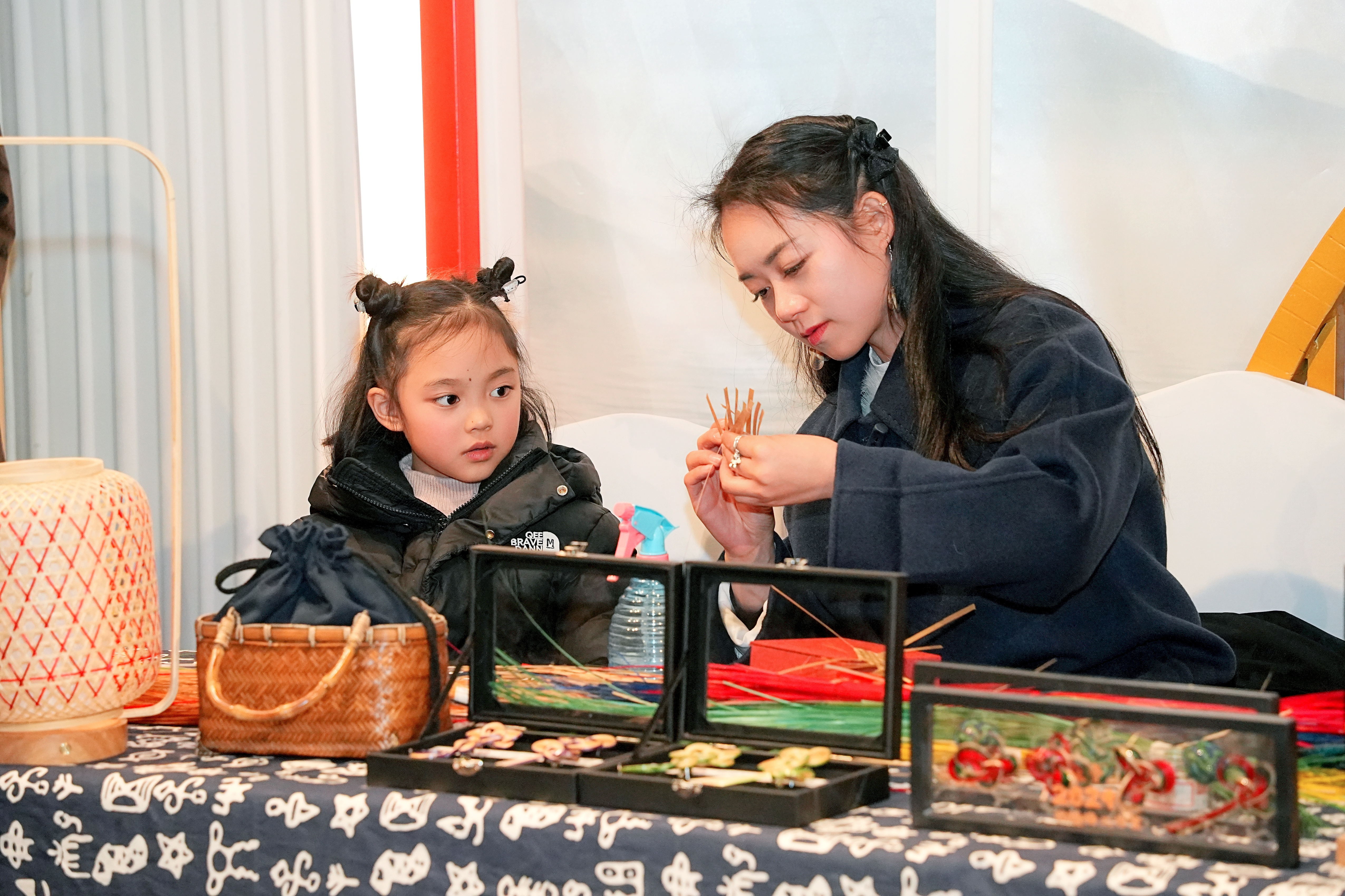 楊隆梅正在給女兒傳授竹編技藝。