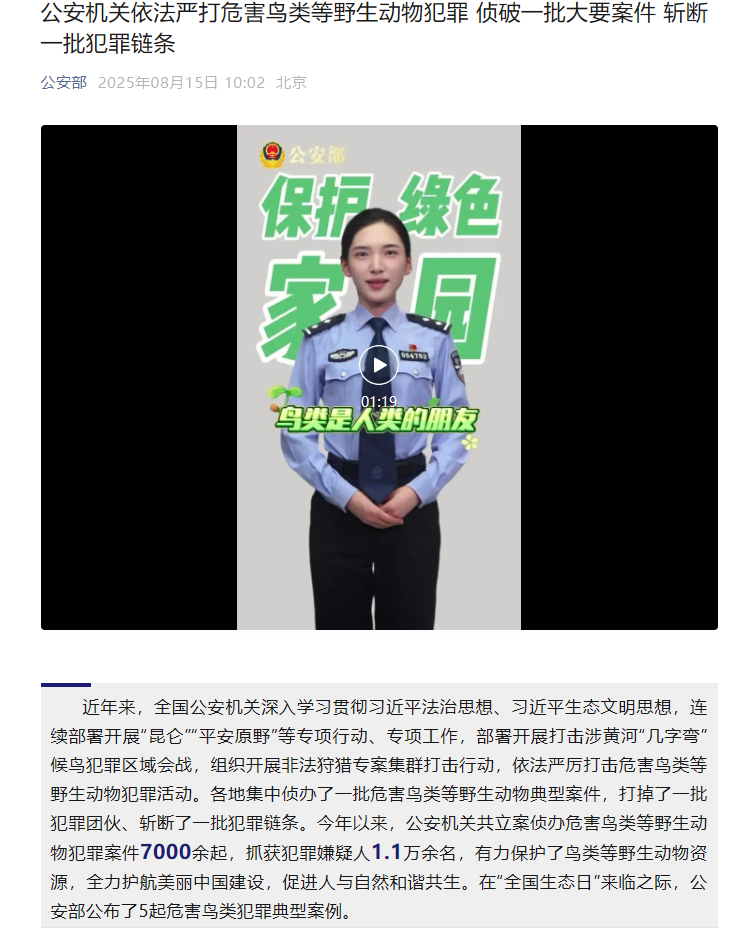 近年來,全國公安機關(guān)深入學習貫徹習近平法治思想、習近平生態(tài)文明思想,連續(xù)部署開展“昆侖”“平安原野”等專項行動、專項工作,部署開展打擊涉黃河“幾字彎”候鳥犯罪區(qū)域會戰(zhàn),組織開展非法狩獵專案集群打擊行動,依法嚴厲打擊危害鳥類等野生動物犯罪活動。各地集中偵辦了一批危害鳥類等野生動物典型案件,打掉了一批犯罪團伙、斬斷了一批犯罪鏈條。今年以來,公安機關(guān)共立案偵辦危害鳥類等野生動物犯罪案件7000余起,抓獲犯罪嫌疑人1.1萬余名,有力保護了鳥類等野生動物資源,全力護航美麗中國建設(shè),促進人與自然和諧共生。在“全國生態(tài)日”來臨之際,公安部公布了5起危害鳥類犯罪典型案例。
