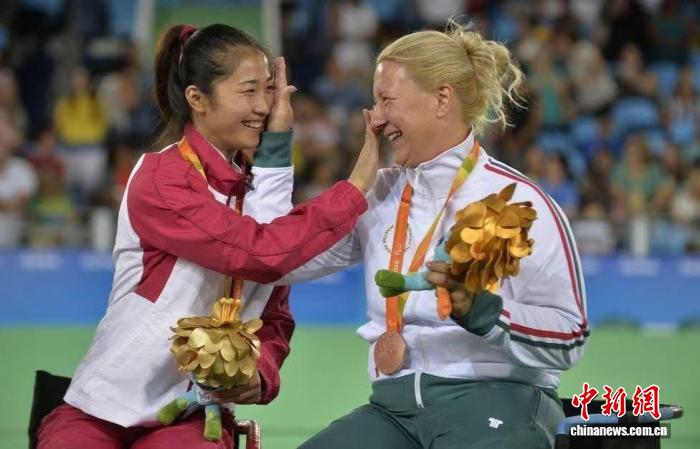 2016年9月14日,里約殘奧會(huì),輪椅擊劍女子個(gè)人花劍A級(jí)比賽冠軍獲得者中國(guó)選手榮靜正與獲得銅牌的匈牙利選手克拉伊尼亞克相互擦拭喜悅的淚水。 薩樂馬什 攝