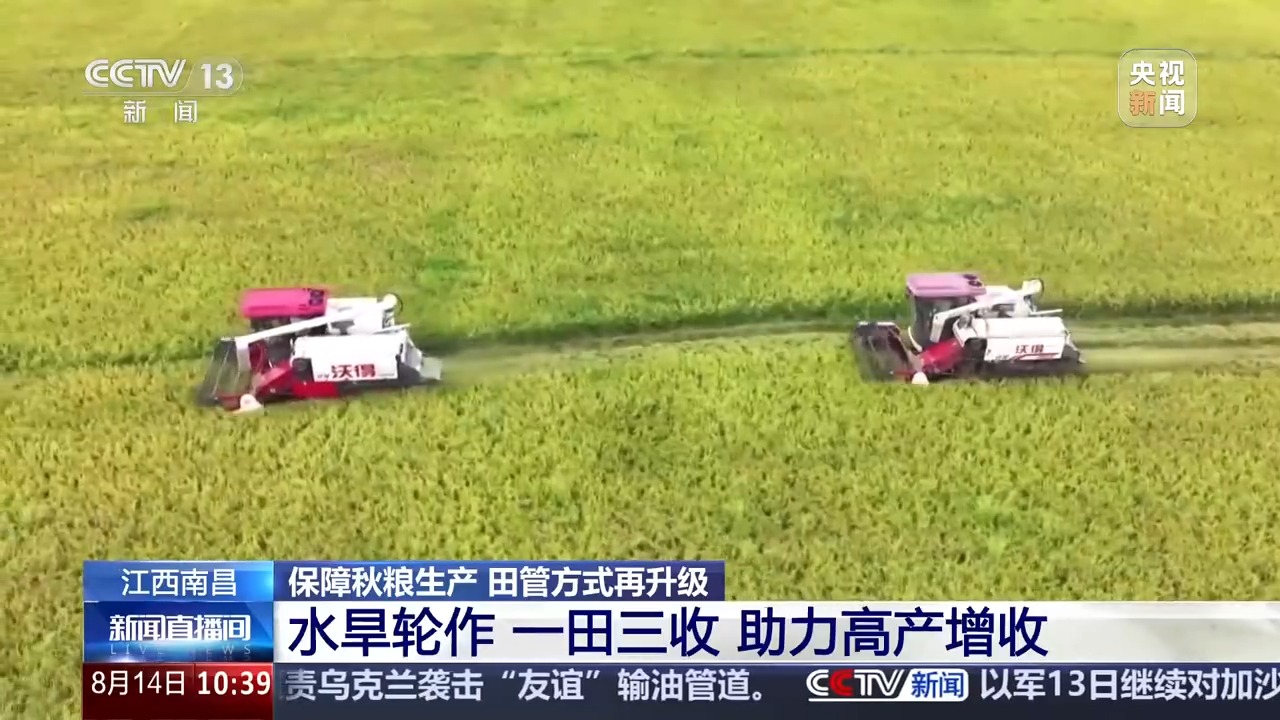 在江西南昌聯(lián)圩鎮(zhèn),一茬茬飽滿的稻穗被迅速收割、脫粒,裝入運輸車輛。而在收割機作業(yè)的田塊旁,翻耕起壟機正加緊作業(yè),農戶們忙著清溝除雜、整理田地,為播種優(yōu)質高產大豆做足準備。今年當?shù)夭捎?strong>水旱輪作、一田三收的種植方式,春季種水稻,初秋收完水稻后搶種大豆,秋末大豆收獲后緊接著種植耐寒蔬菜或油菜,三季作物茬口緊密銜接,全年無閑田。同時,通過推廣良種、測土配方施肥等技術,確保每種作物都能優(yōu)質高產。