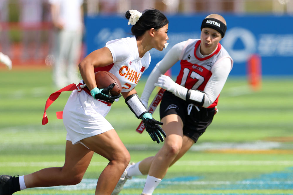 8月14日,在2025年成都世運(yùn)會(huì)腰旗橄欖球女子預(yù)賽A組比賽中,中國隊(duì)45:47不敵奧地利隊(duì)。圖為中國隊(duì)球員高子旋(左)在比賽中。新華社記者 陳斌 攝