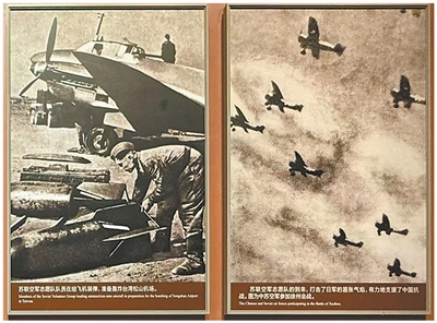 中國(guó)人民抗日戰(zhàn)爭(zhēng)紀(jì)念館中展示的蘇聯(lián)援華航空隊(duì)老照片。左側(cè)照片為蘇聯(lián)援華航空隊(duì)成員為飛機(jī)裝彈,準(zhǔn)備轟炸被日軍占領(lǐng)的臺(tái)北松山機(jī)場(chǎng)。右側(cè)照片為1938年中蘇空軍參加徐州會(huì)戰(zhàn)。