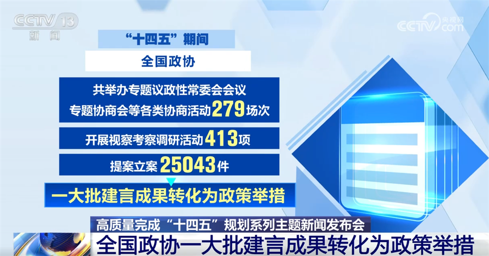 “十四五”期間,全國政協(xié)共舉辦專題議政性常委會(huì)會(huì)議、專題協(xié)商會(huì)等各類協(xié)商活動(dòng)279場次,開展視察考察調(diào)研活動(dòng)413項(xiàng),提案立案25043件,一大批建言成果轉(zhuǎn)化為政策舉措。