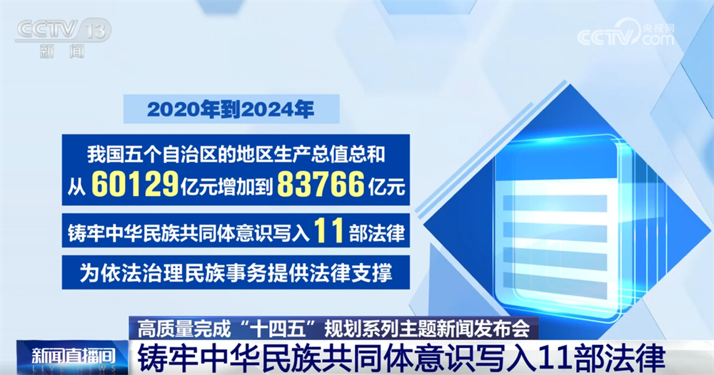 據(jù)了解,2020年到2024年,我國五個(gè)自治區(qū)的地區(qū)生產(chǎn)總值總和從60129億元增加到83766億元。鑄牢中華民族共同體意識(shí)寫入11部法律,為依法治理民族事務(wù)提供法律支撐。