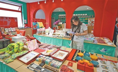 游客在北京地安門主題郵局選購文創(chuàng)產(chǎn)品。