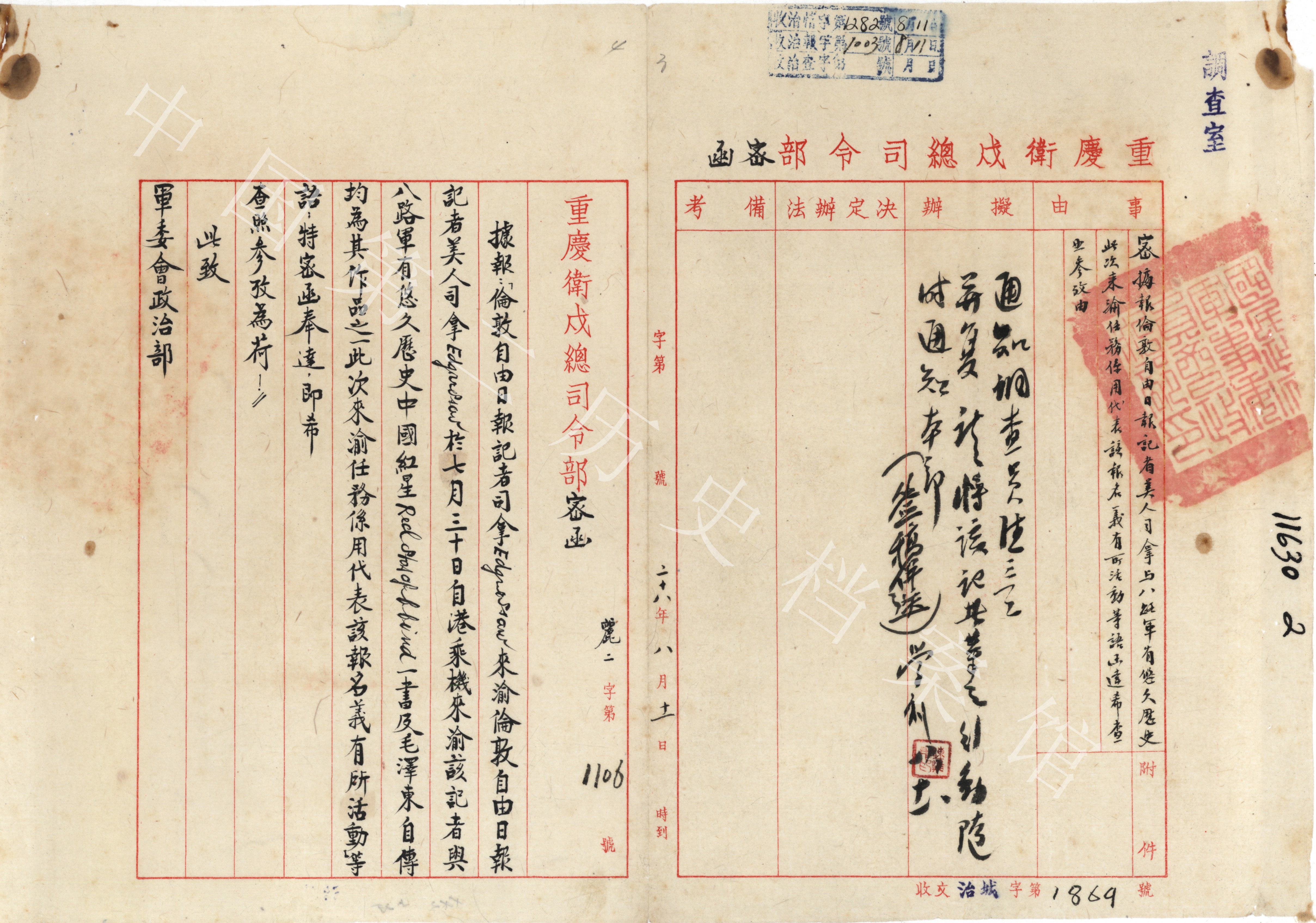 1939年8月重慶衛(wèi)戍總部向國民政府軍事委員會政治部報告斯諾在重慶活動情形的密函(中國第二歷史檔案館藏)