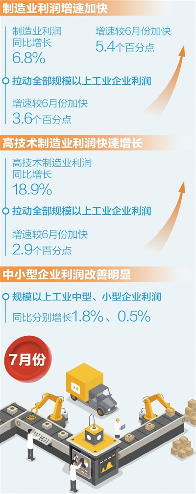 高技術(shù)制造業(yè)利潤快速增長,引領(lǐng)作用明顯。7月份,高技術(shù)制造業(yè)利潤由6月份下降0.9%轉(zhuǎn)為增長18.9%,拉動全部規(guī)模以上工業(yè)企業(yè)利潤增速較6月份加快2.9個百分點,引領(lǐng)作用明顯。其中,航空航天器及設(shè)備制造行業(yè)利潤增長40.9%,生物藥品制造、化學藥品制劑制造等行業(yè)利潤分別增長36.3%、6.9%。