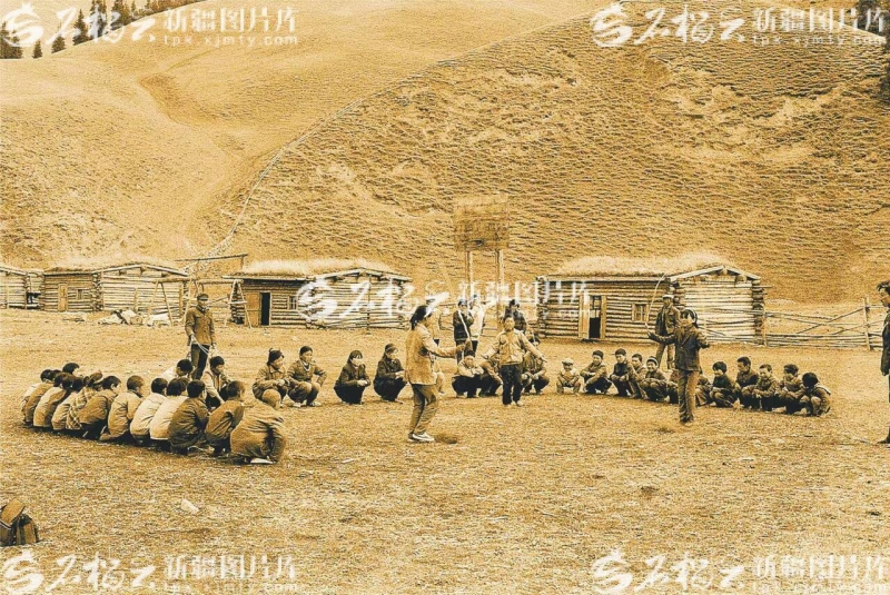 新疆圖片庫里,一張泛黃的老照片,生動再現(xiàn)了烏魯木齊縣水西溝鎮(zhèn)廟爾溝中學的“孩提”時光:光禿禿的大山腳下,幾座松木搭建起來的簡易房屋,矮趴趴“長”在草場上。遠處空地上,一群學生們蹲在地上圍成圈,正在觀看幾個同學進行跳繩比賽。