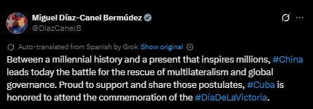 據(jù)拉美媒體報(bào)道,古巴共產(chǎn)黨中央委員會(huì)第一書記、古巴國(guó)家主席迪亞斯-卡內(nèi)爾就中國(guó)人民抗日戰(zhàn)爭(zhēng)暨世界反法西斯戰(zhàn)爭(zhēng)勝利80周年,向中國(guó)人民和政府表示祝賀。