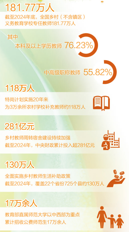 這是真金白銀的投入。2024年,特崗教師工資性補(bǔ)助再次提標(biāo),每人每年增加3600元;鄉(xiāng)村教師生活補(bǔ)助政策深入實(shí)施,受益教師約130萬(wàn)人,人均月補(bǔ)助金額約400元;鄉(xiāng)村教師周轉(zhuǎn)宿舍建設(shè)持續(xù)加強(qiáng),中央財(cái)政累計(jì)投入超281億元,建設(shè)約63.7萬(wàn)套。