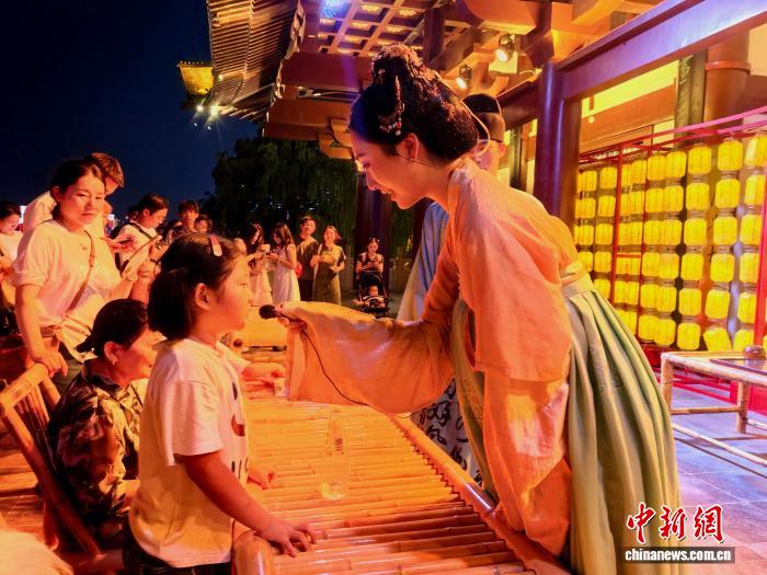 9月5日,長沙杜甫江閣“喜相逢”唐風(fēng)互動(dòng)夜游活動(dòng)中,演員正在與觀眾互動(dòng)。張雪盈 攝