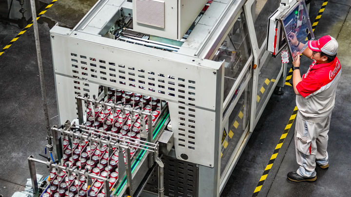 中糧可口可樂飲料(貴州)有限公司的工作人員在生產(chǎn)線旁進(jìn)行操作(2025年8月24日攝)。