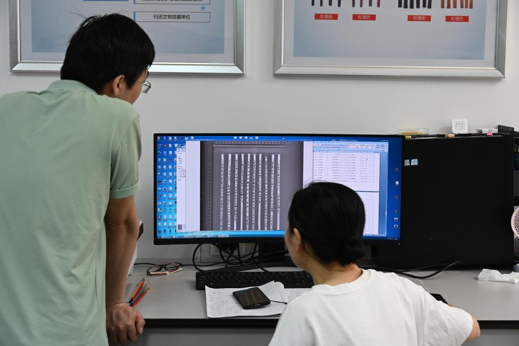 在荊州文物保護(hù)中心,工作人員檢查掃描后的竹簡文字。新華社記者黃曉勇 攝