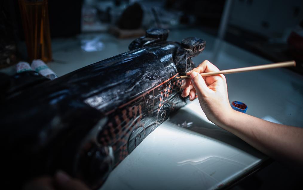 在荊州文物保護(hù)中心,文物修復(fù)人員修復(fù)一件戰(zhàn)國獸形酒具盒。新華社記者肖藝九 攝