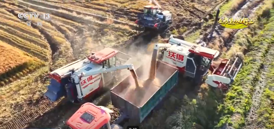 在綏濱縣新富鄉(xiāng)的稻田里,多臺現(xiàn)代化收割機(jī)正在緊張作業(yè)。伴隨著機(jī)器的轟鳴聲,一排排稻稈被快速卷入收割機(jī),經(jīng)過脫粒、篩選等工序,飽滿的稻谷源源不斷地從出糧口傾瀉而出,裝入一旁等候的運(yùn)輸車輛中。