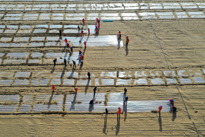 在新疆和田地區(qū)于田縣沙產(chǎn)業(yè)實(shí)驗(yàn)基地,當(dāng)?shù)厝罕娫诜N植薏米(2025年4月8日攝,無人機(jī)照片)。新華社記者 丁磊 攝