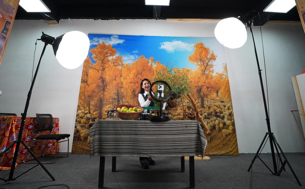 9月19日,尉犁縣電商協(xié)會(huì)負(fù)責(zé)人米日阿依·阿西木在達(dá)西村的電商基地直播推介達(dá)西村農(nóng)產(chǎn)品。近年來,達(dá)西村構(gòu)建“農(nóng)戶生產(chǎn)+企業(yè)加工包裝+電商銷售+物流配送”全產(chǎn)業(yè)鏈,為縣域經(jīng)濟(jì)發(fā)展培養(yǎng)孵化本土直播電商人才,促進(jìn)傳統(tǒng)產(chǎn)業(yè)轉(zhuǎn)型升級(jí)。