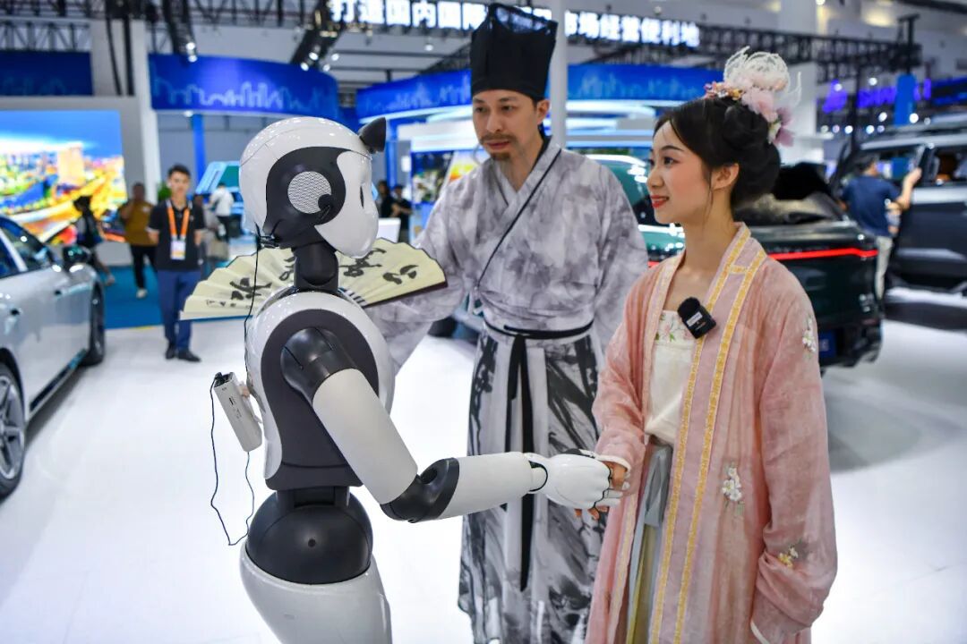 2024年4月15日,海南??冢谒膶弥袊鴩H消費(fèi)品博覽會(huì)上,身著漢服的參觀者與“柔美人形智能服務(wù)機(jī)器人”互動(dòng)。中新社記者 駱云飛 攝