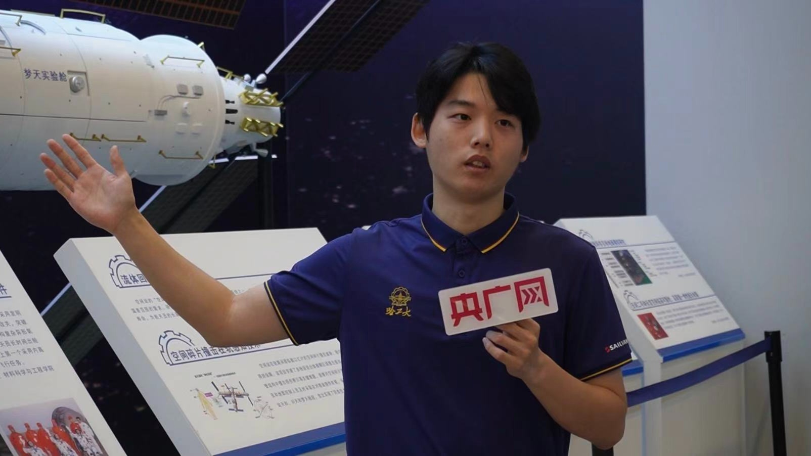 學(xué)生講解員郭鎮(zhèn)宇介紹由哈工大參與研制的問天實(shí)驗(yàn)艙小機(jī)械臂(央廣網(wǎng)發(fā) 王語詩(shī) 攝)
