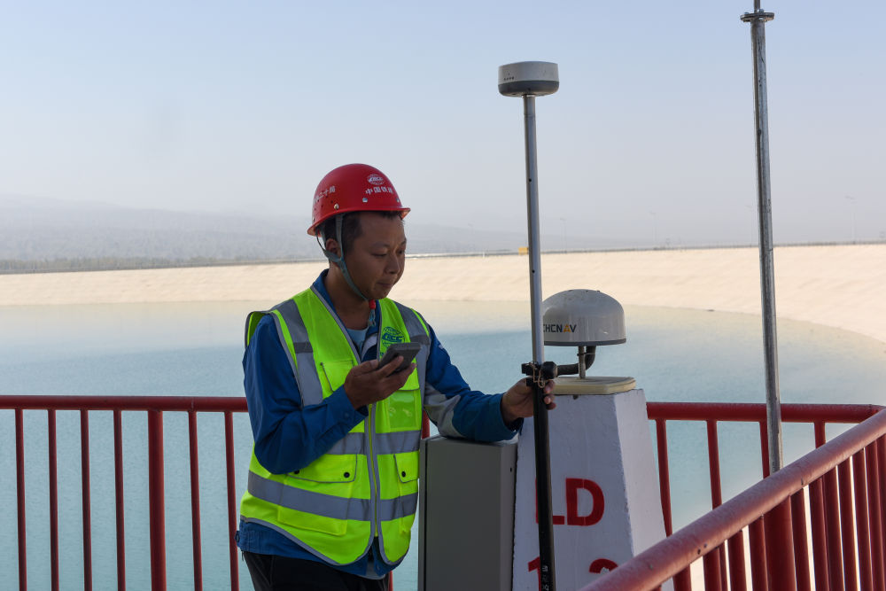 ↑ 11月1日,施工人員在奧吞勒克水庫檢查閘控系統(tǒng)設備試運行情況。