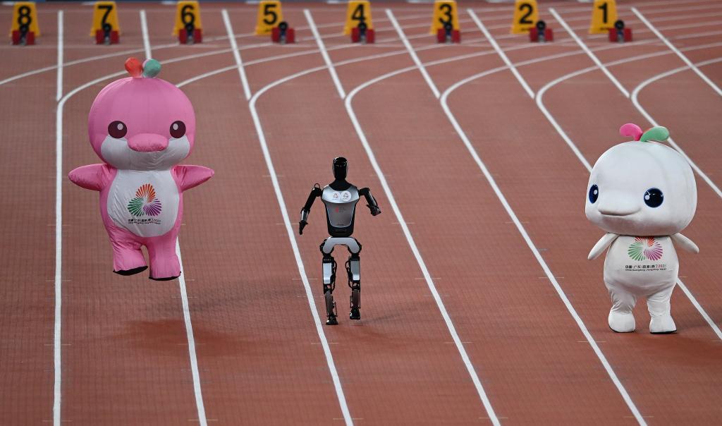 11月17日,在田徑項(xiàng)目賽事開始前的暖場活動(dòng)中,機(jī)器人和吉祥物喜洋洋、樂融融在廣東奧體中心體育場賽跑。