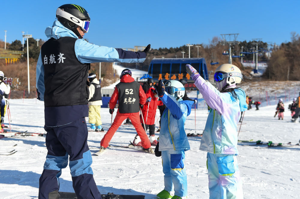 12月3日,在長(zhǎng)春市天定山滑雪場(chǎng),學(xué)生們跟隨教練學(xué)習(xí)滑雪。新華社記者 張楠 攝