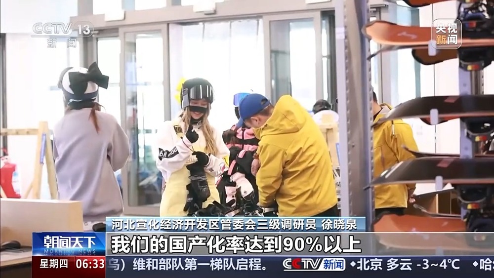 總臺央視記者 杜思源:冰雪產(chǎn)業(yè),從造雪制冰開始,到滑雪場的纜車、壓雪車等設(shè)施,再到我們使用的雪服雪板等等,涉及的門類繁多。推動冰雪經(jīng)濟高質(zhì)量發(fā)展,不同產(chǎn)線的協(xié)作、區(qū)域間的高效協(xié)同,至關(guān)重要。我現(xiàn)在是在河北崇禮的一家滑雪場,距離這里一個小時車程,就是當(dāng)?shù)氐谋┊a(chǎn)業(yè)園。在京津冀地區(qū)的多個雪場,都有來自這座產(chǎn)業(yè)園的冰雪裝備。