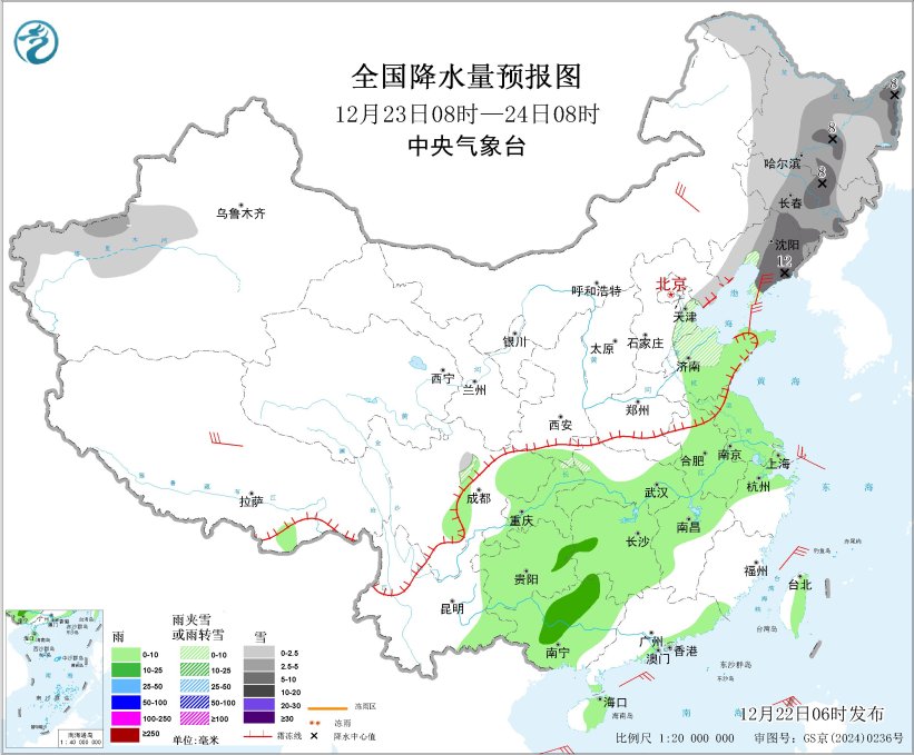 12月23日08時至24日08時,東北地區(qū)、新疆南疆西部山區(qū)、華北東部、山東北部等地部分地區(qū)有小到中雪或雨夾雪,其中,黑龍江中東部、吉林中部、遼寧東部局地大到暴雪(10~12毫米)。黃淮東部、江淮、江漢大部、江南北部和西部、西南地區(qū)東部、廣西、廣東東南部沿海、海南島東部、臺灣島東部等地部分地區(qū)有小雨,其中,湖南西部、貴州東北部、廣西中部等地部分地區(qū)有中雨。內蒙古中東部、遼東半島、西藏中北部等地部分地區(qū)有4~6級風;渤海、渤海海峽、黃海大部海域、東海西部海域、臺灣海峽、巴士海峽、南海北部海域將有6~7級大風、陣風8~9級。