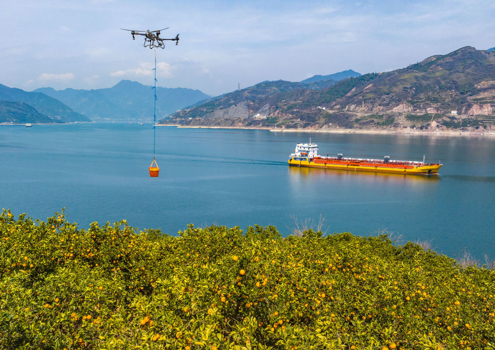 2025年3月17日,湖北省秭歸縣郭家壩鎮(zhèn)鄧家坡村村民用無(wú)人機(jī)轉(zhuǎn)運(yùn)臍橙(無(wú)人機(jī)照片)。新華社發(fā)(鄭家裕攝)