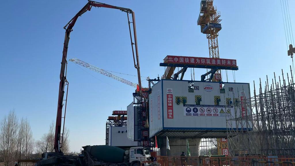 在中鐵二十一局集團(tuán)有限公司施工現(xiàn)場,架橋機(jī)正在作業(yè)。(馬辰 攝)