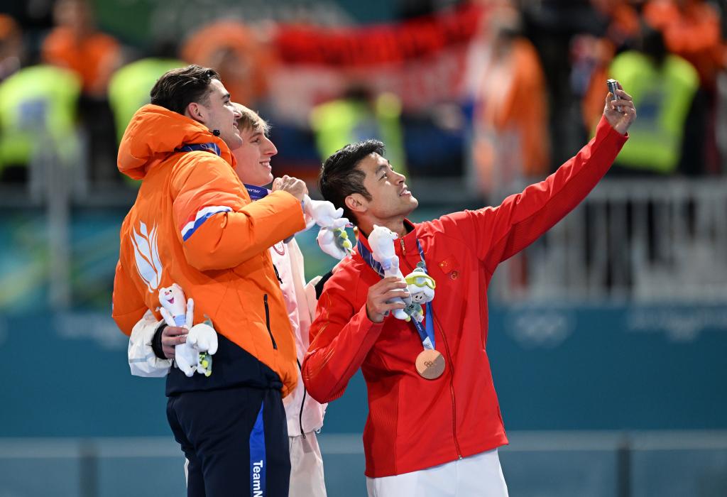 2月11日,冠軍美國選手斯托爾茲(中)、亞軍荷蘭選手德布(左)和季軍中國選手寧忠?guī)r在頒獎儀式上自拍。新華社記者 武巍 攝