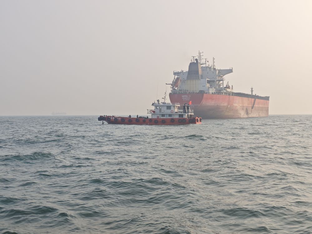 靠在貨輪旁邊,我們乘坐的執(zhí)勤艇晃得更加猛烈。在貨輪的襯托下,民警的身形顯得格外渺小。出于安全考慮,記者選擇在執(zhí)勤艇上等候。