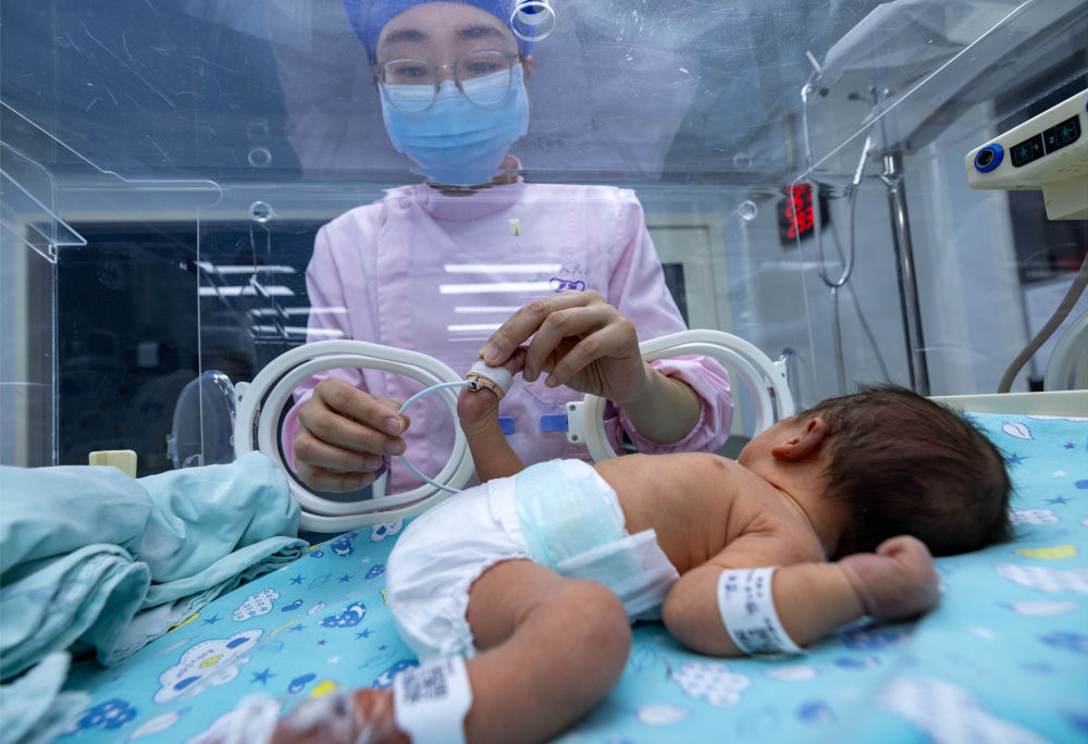 ↑ 2月16日,在南京醫(yī)科大學附屬泰州人民醫(yī)院新生兒科,護士為新生兒護理。新華社發(fā)(湯德宏攝)