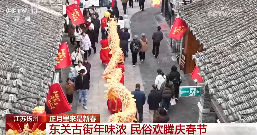 我們現(xiàn)在看到的是江蘇揚州東關(guān)歷史文化街區(qū)。春節(jié)假期,東關(guān)城門之下,舞龍表演熱鬧開場,金龍翻騰跳躍、氣勢昂揚,鏗鏘有力的音樂此起彼伏,引得市民游客紛紛駐足圍觀、拍手叫好,將新春的喜慶氛圍推向高潮。